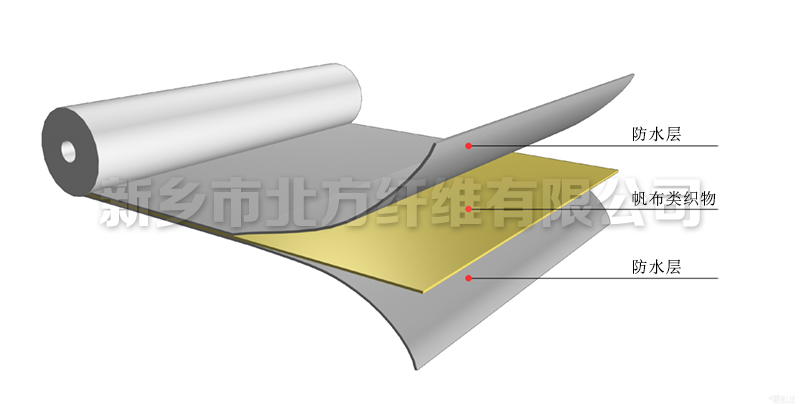 蓬蓋織物的結(jié)構(gòu)類似于"三明治",即以帆布類織物作為骨架材料,在帆布的上下兩面涂覆防水層。帆布在其中起骨架作用并承擔力學性能,上下兩面的涂覆層承擔防水作用。