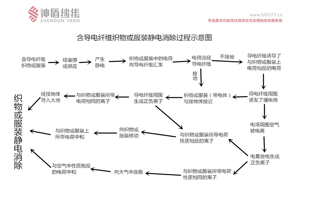 在電暈放電的同時(shí),誘導(dǎo)電荷聚集在導(dǎo)電纖維的周圍,進(jìn)而泄露入大地。當(dāng)帶電體(織物或服裝)與接地的導(dǎo)電纖維接近時(shí),在導(dǎo)電纖維周圍生成正負(fù)離子,其中與帶電體所帶電荷相反的離子向帶電體移動(dòng)而中和,與帶電體所帶電荷相同的離子通過導(dǎo)電纖維向大地泄露,靜電消除。