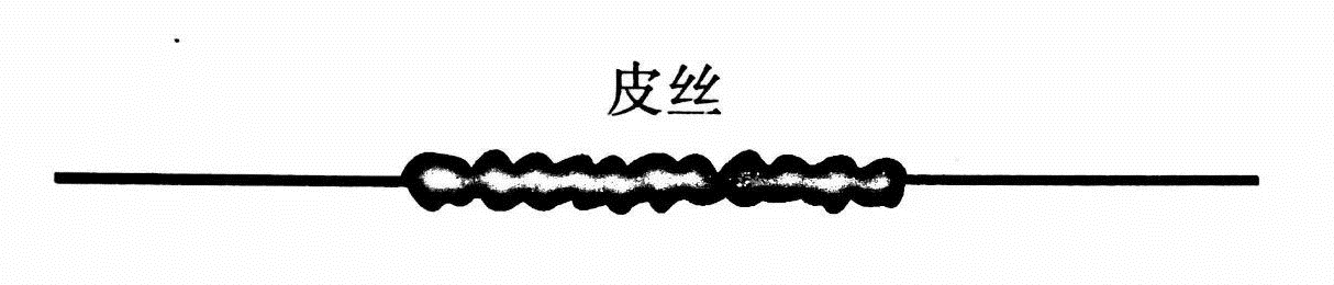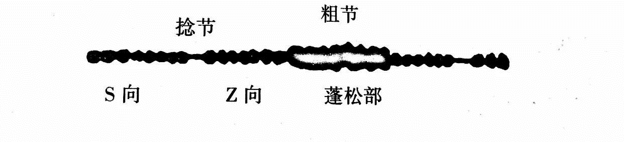 (5)混捻假捻絲絲條加工中在加捻區(qū)和解捻區(qū)形成了有正、反兩種捻度,所以從總體上講,正、反捻度抵消而“無捻”,而在絲條的局部卻有正、反的捻度,從而形成混捻假捻變形絲(圖10),它有單股型及混纖型兩種。