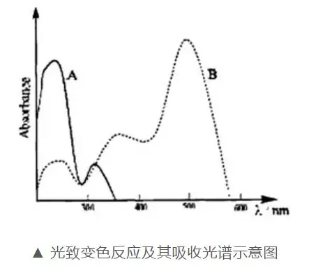 一個化合物(A)在受到一定波長的光照下,進(jìn)行光化學(xué)反應(yīng),生成產(chǎn)物(B),由于化合物結(jié)構(gòu)的改變導(dǎo)致其吸收光譜發(fā)生明顯的變化即發(fā)生顏色變化,而在另一波長的照射下(或熱的作用下),又能恢復(fù)到原來狀態(tài)的現(xiàn)象。就是說某一物質(zhì)在兩種狀態(tài)之間的可逆變化,其中至少有一個方向的變化是由光輻射引起的。