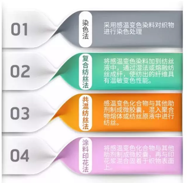 某些溫敏材料是結(jié)晶物質(zhì),加熱到一定溫度其晶型發(fā)生變化,從而導(dǎo)致顏色改變,冷卻至室溫后,晶型恢復(fù),顏色也隨之復(fù)原。 另一些有溫敏性能的有機(jī)物,由于溫度變化會引起部分結(jié)構(gòu)、pH 、結(jié)晶水、電子數(shù)的變化或達(dá)到熔點后物質(zhì)體系的顏色發(fā)生變化。 將這些物質(zhì)引入纖維和紡織品即制得可以實現(xiàn)從“有色==無色”狀態(tài)的顏色變化的織物。