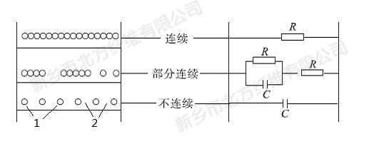 b:一部分導電顆粒不完全連續(xù)接觸,其中不相互接觸的導電顆粒之間由于隧道效應形成電流通路,相當于一個電阻與一個電容并聯(lián)后再與一個電阻串聯(lián)的情況。