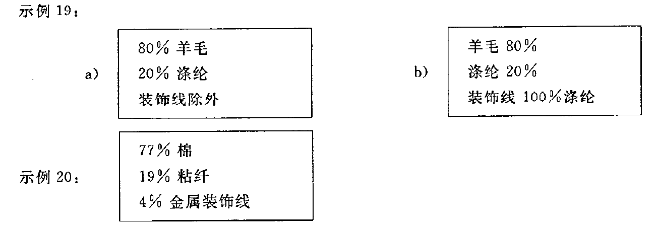 6 .12在產(chǎn)品中存在易于識別的花紋或圖案的裝飾纖維或裝飾紗線(若拆除裝飾纖維或紗線會破壞產(chǎn)品的結(jié)構(gòu)),當(dāng)其纖維含量≤5%時,可表示為“裝飾部分除外”,也可單獨將裝飾線的纖維含量標(biāo)出(見示例19)。如果需要,可以表明裝飾線的纖維成分及其占總量的百分比(見示例20)。
