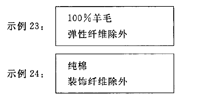 7.2產(chǎn)品或產(chǎn)品的某一部分中含有能夠判斷為是裝飾纖維或特性纖維(例如,彈性纖維、導(dǎo)電纖維等),且這些纖維的總含量≤5%(純毛粗紡產(chǎn)品≤7%)時,可使用“100%”、“純”或“全”表示纖維含量,并說明“XX纖維除外”(見示例23和示例24),標(biāo)明的纖維含量允差為0。