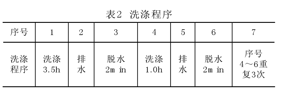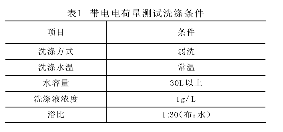 在對防靜電毛針織服進行帶電電荷量測試前應(yīng)按照規(guī)定的方法進行洗滌,洗滌時間為6.5h,與GB12014-2009《防靜電服》標(biāo)準(zhǔn)中的洗滌方法相同,用中性洗滌液連續(xù)弱檔洗滌、水溫為常溫。其洗滌條件和程序,見表1、表2.