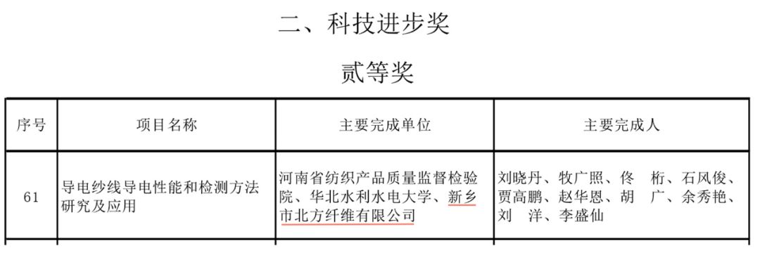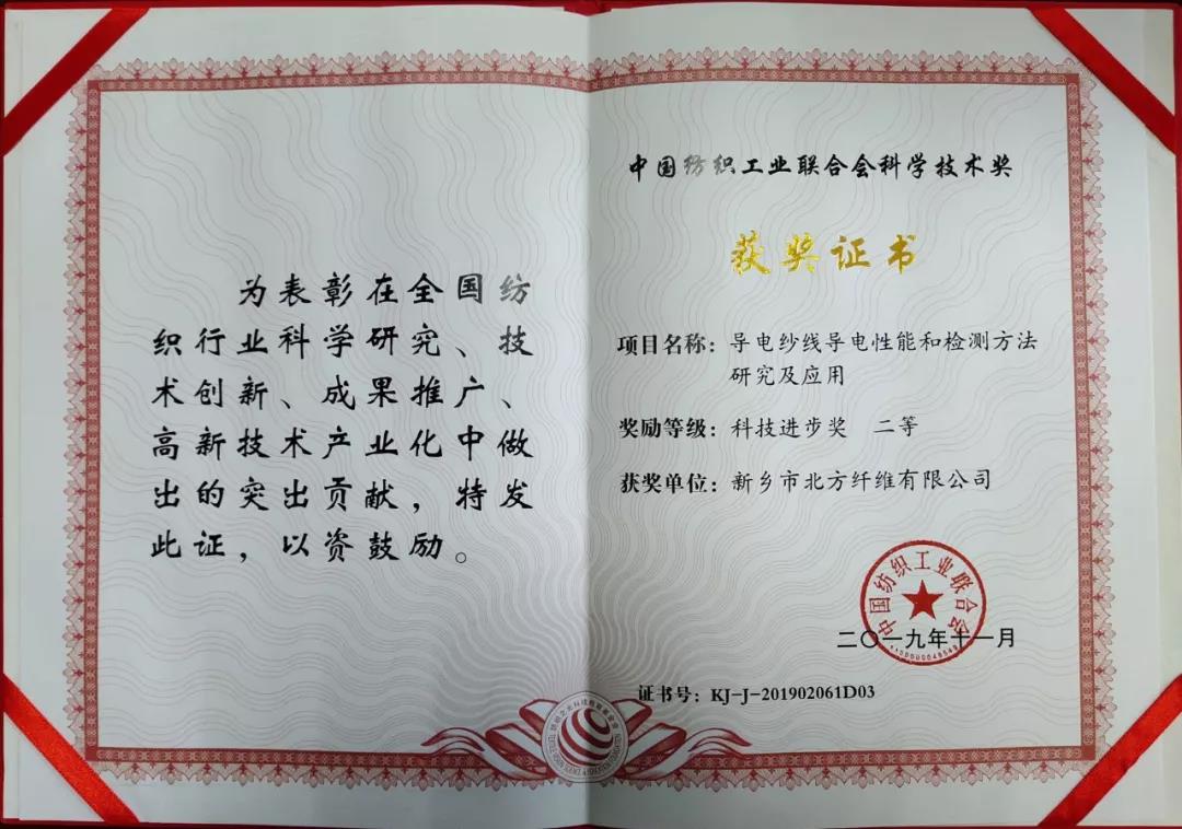 新鄉(xiāng)市北方纖維有限公司與河南省紡織產(chǎn)品質(zhì)量監(jiān)督檢驗(yàn)院、華北水利水電大學(xué)合作的"導(dǎo)電紗線導(dǎo)電性能和檢測(cè)方法研究及應(yīng)用"獲:紡織之光科技進(jìn)步二等獎(jiǎng)。