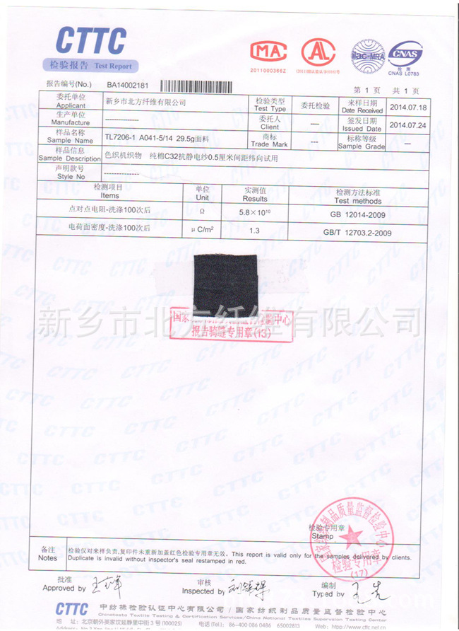 近日,北方纖維將神盾防靜電紗線所制成的成品防靜電布送國(guó)家紡織制品質(zhì)量監(jiān)督檢測(cè)中心檢測(cè),檢測(cè)結(jié)果全部達(dá)到國(guó)家B級(jí)標(biāo)準(zhǔn)